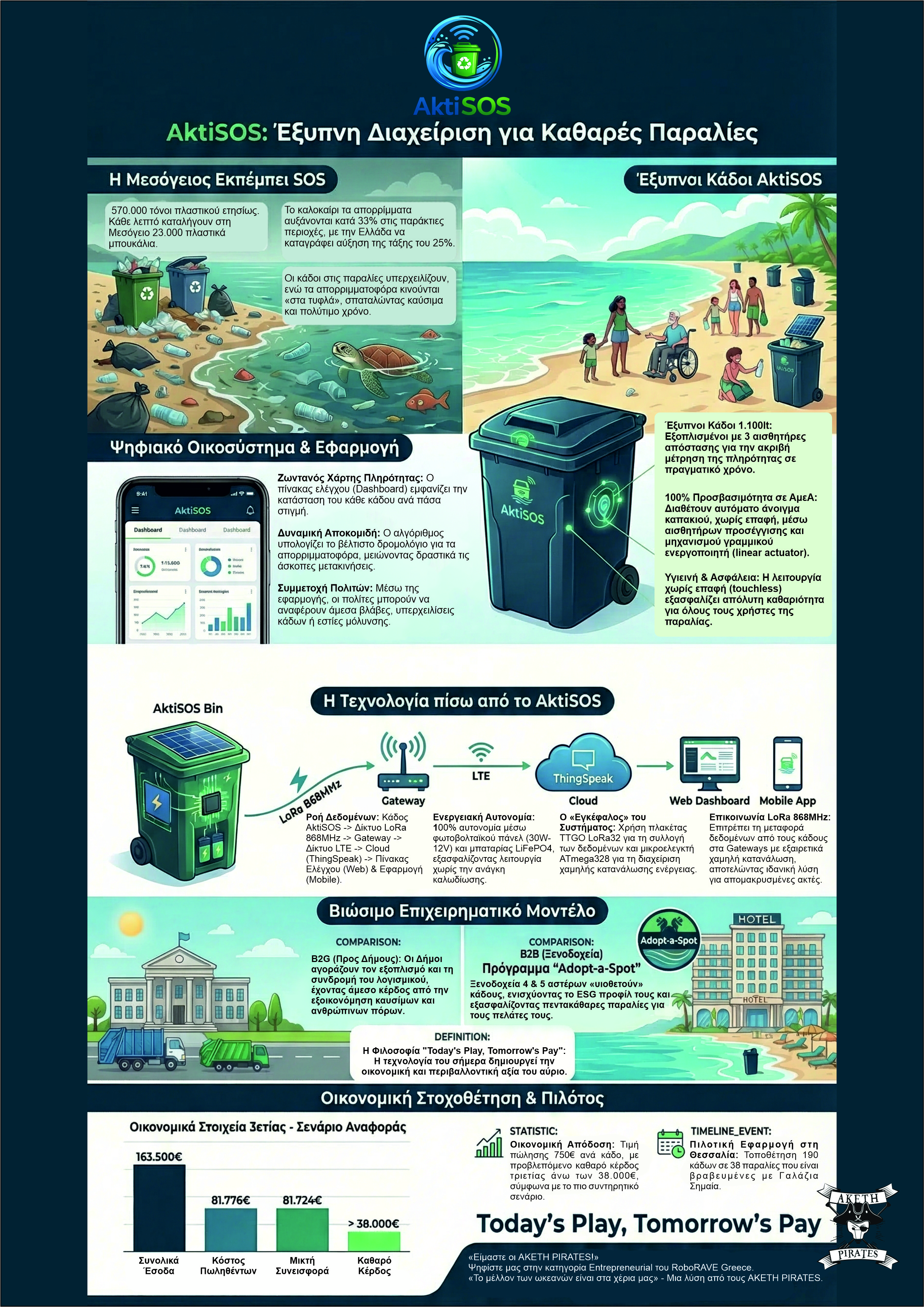 Το έργο AktiSOS αποτελεί μια αναβαθμισμένη και πιο ολοκληρωμένη περιβαλλοντική πρόταση που αναπτύχθηκε από την ομάδα ρομποτικής AKETH PIRATES. Βασίζεται στην εμπειρία και τα αποτελέσματα του προηγούμενου project «Η Μεσόγειος εκπέμπει SOS», εξελίσσοντάς το σε μια λύση που δεν περιορίζεται στην απλή ενημέρωση, αλλά οργανώνει δράση για τη διατήρηση καθαρών ακτών. Στόχος του έργου είναι να προσφέρει ένα πρακτικό εργαλείο για τη διαχείριση απορριμμάτων σε παραλίες και παράκτιες περιοχές, ειδικά σε περιόδους αυξημένης τουριστικής κίνησης, όταν η πίεση στις υποδομές καθαριότητας γίνεται ιδιαίτερα έντονη.